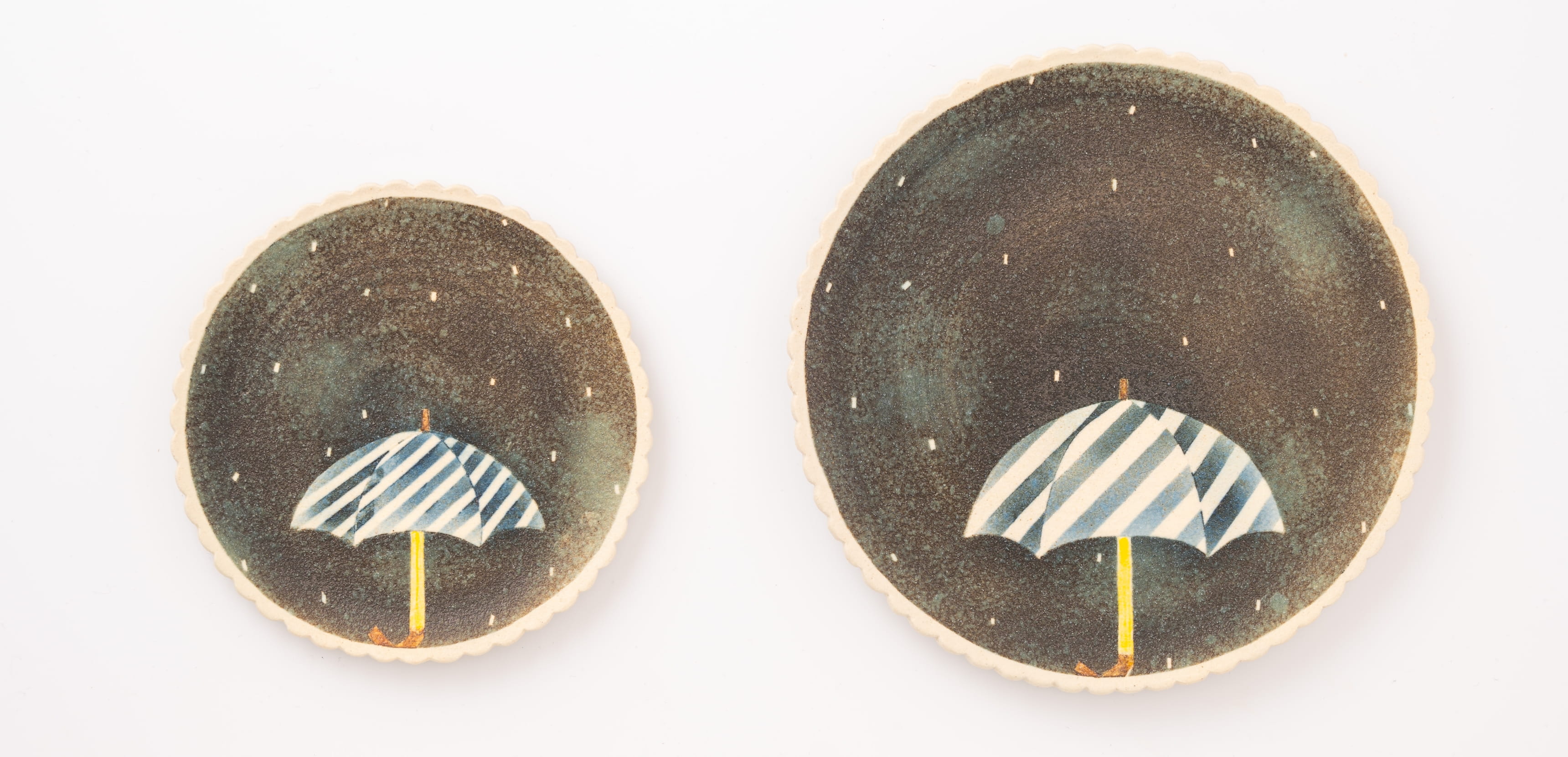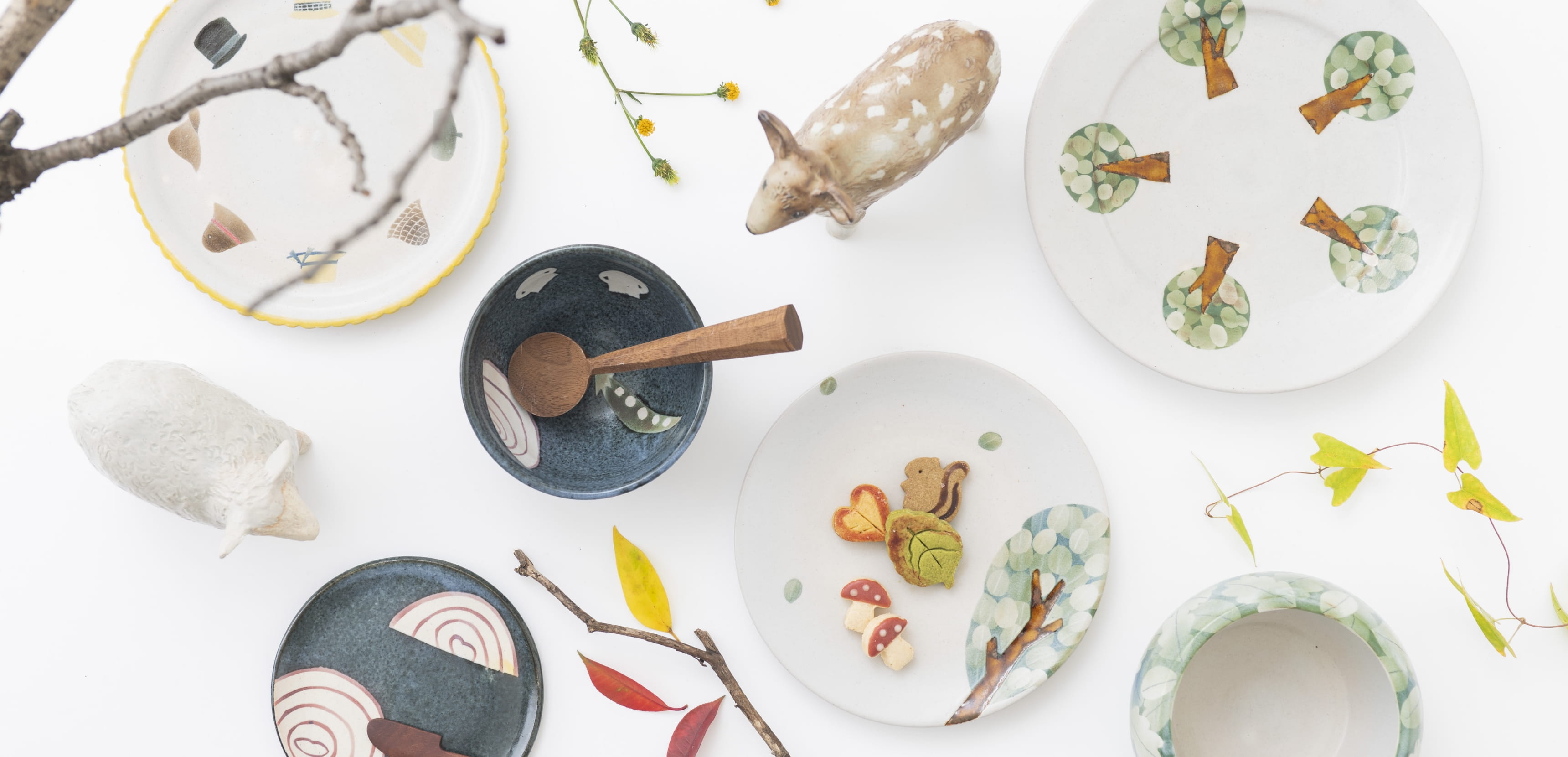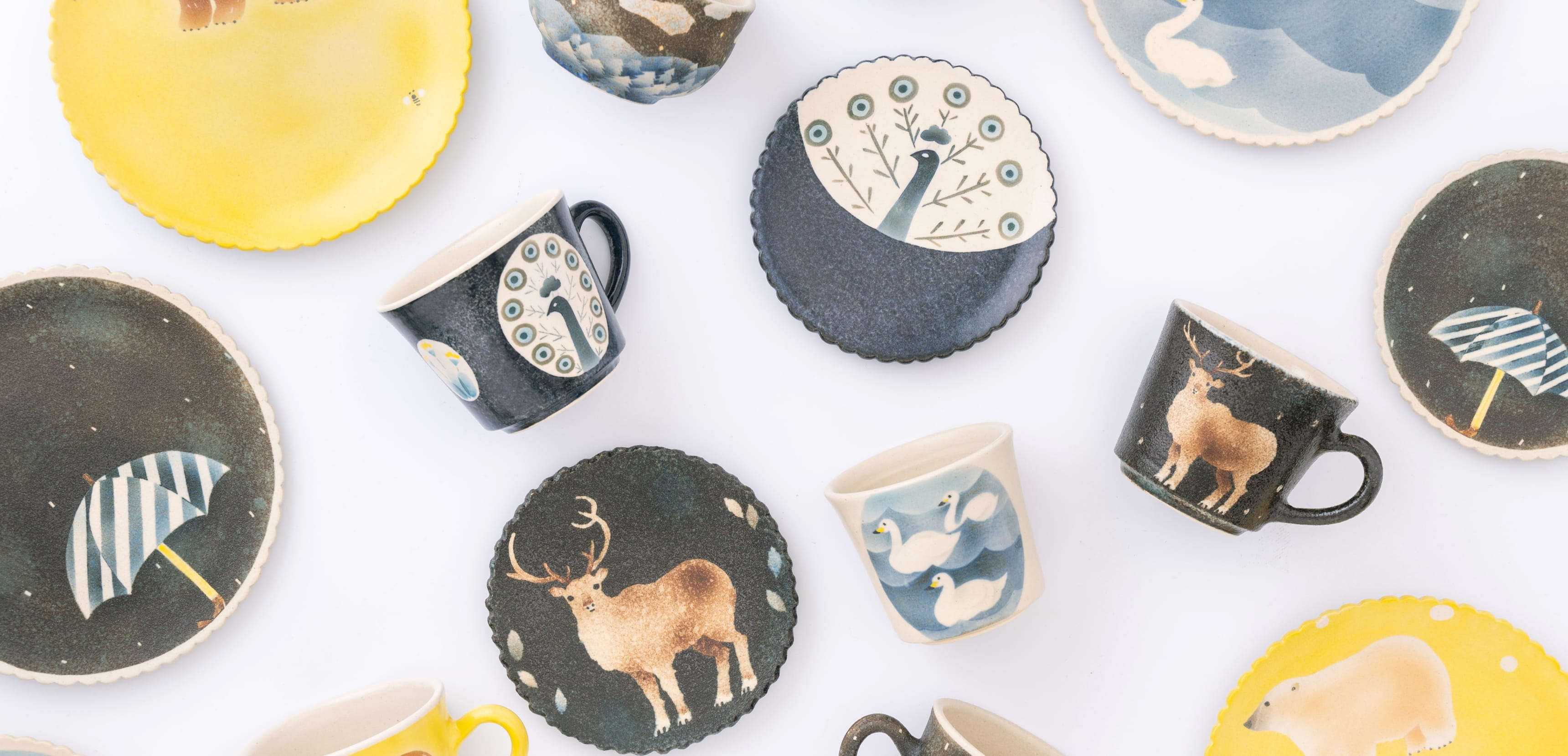 I create items with basic forms for everyday use and draw by airbrush to add cheerful and gentle motifts inspired by natural scenery.